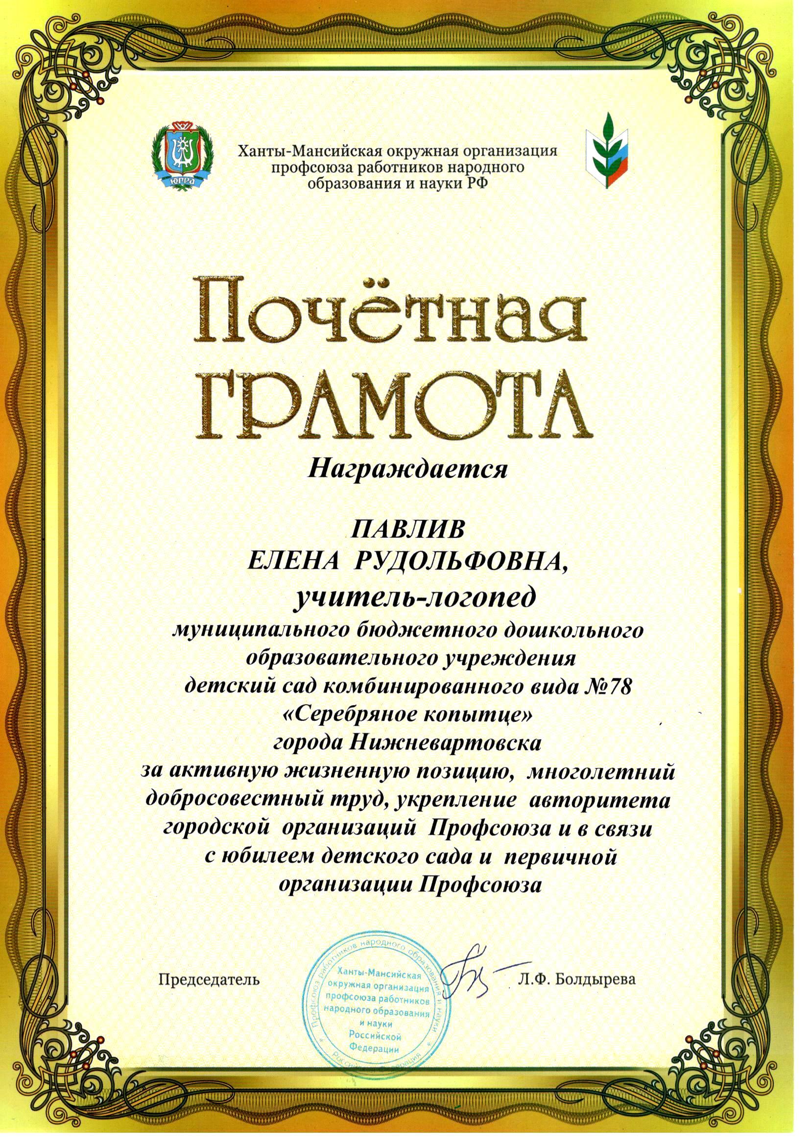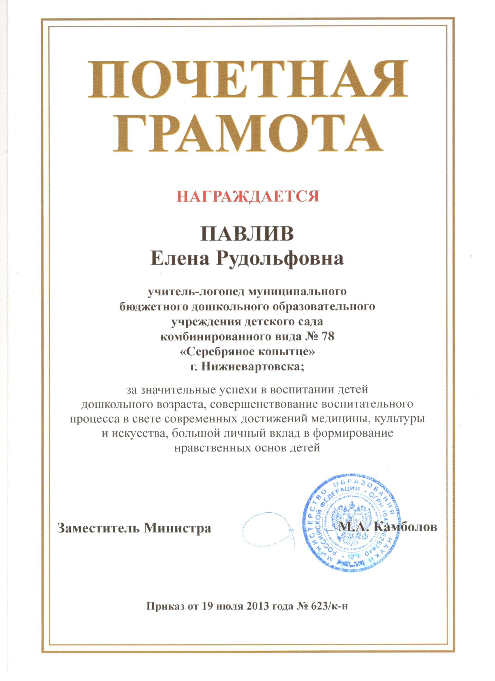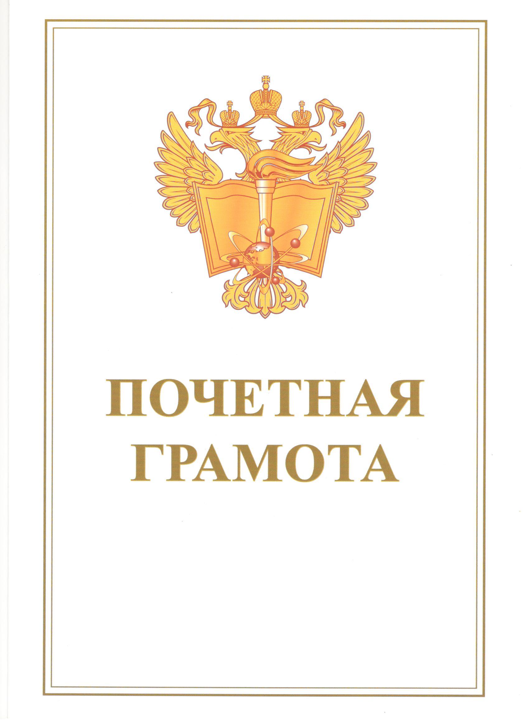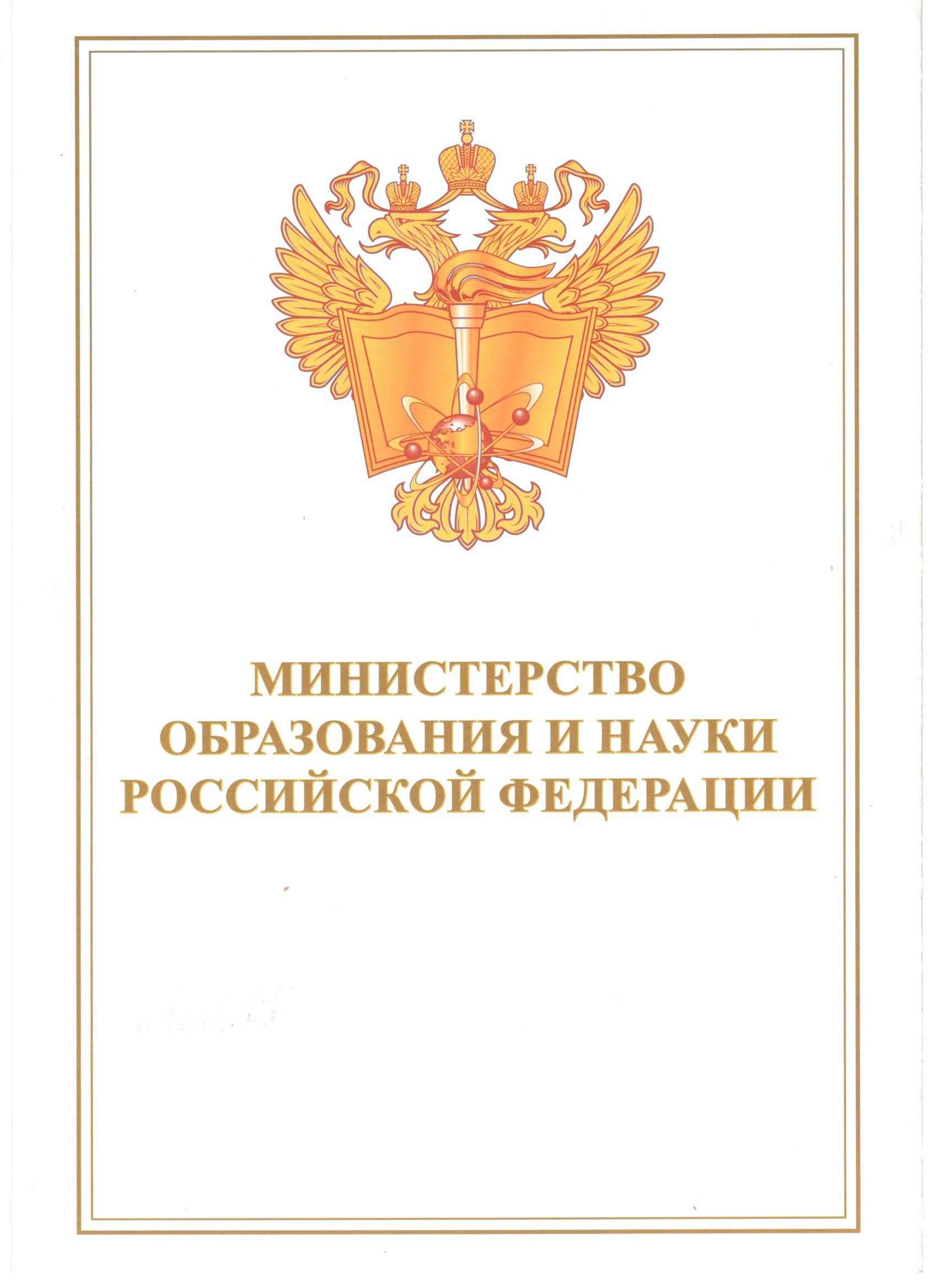 Почетная грамота Министерства образования и науки Российской Федерации