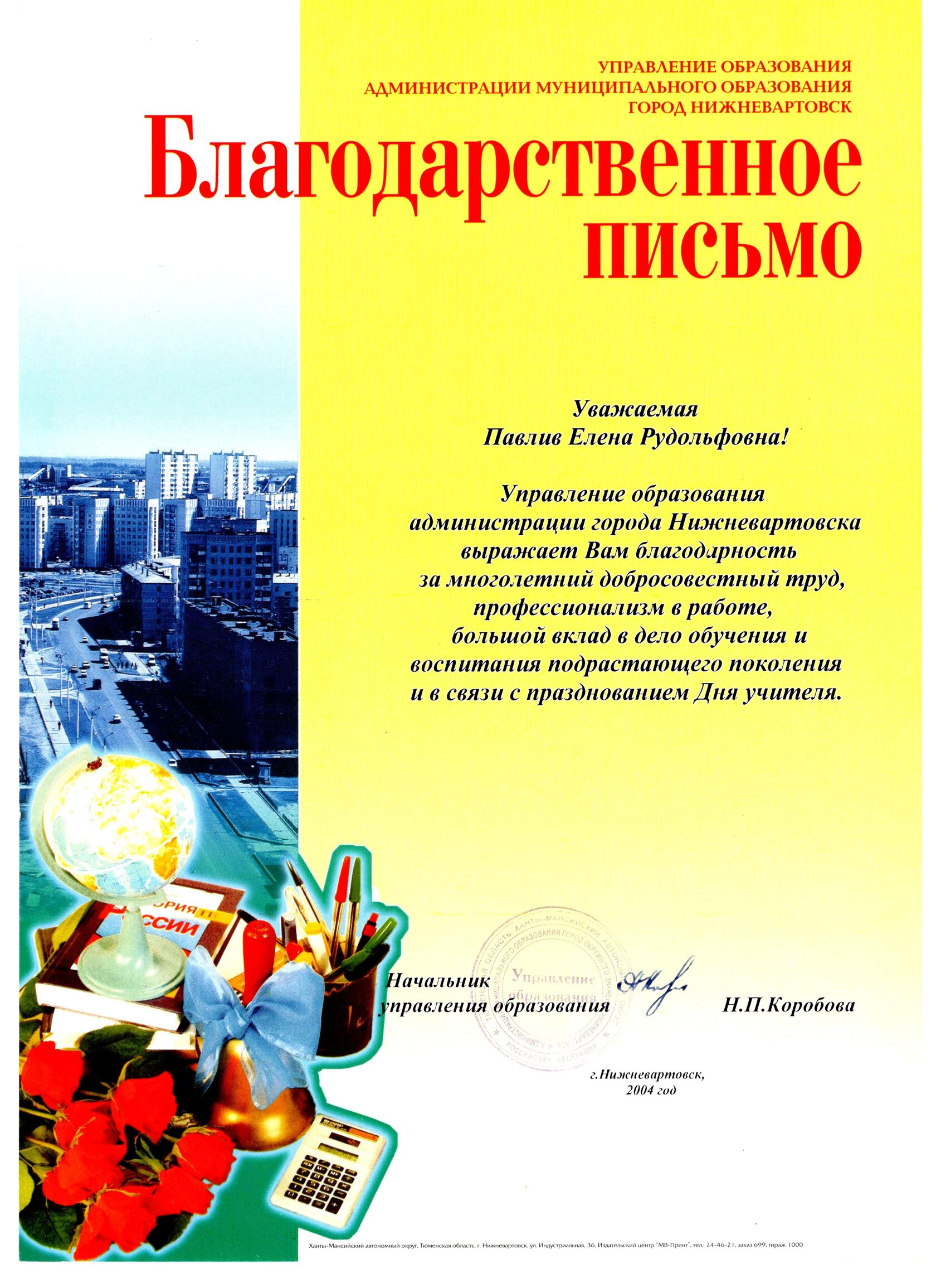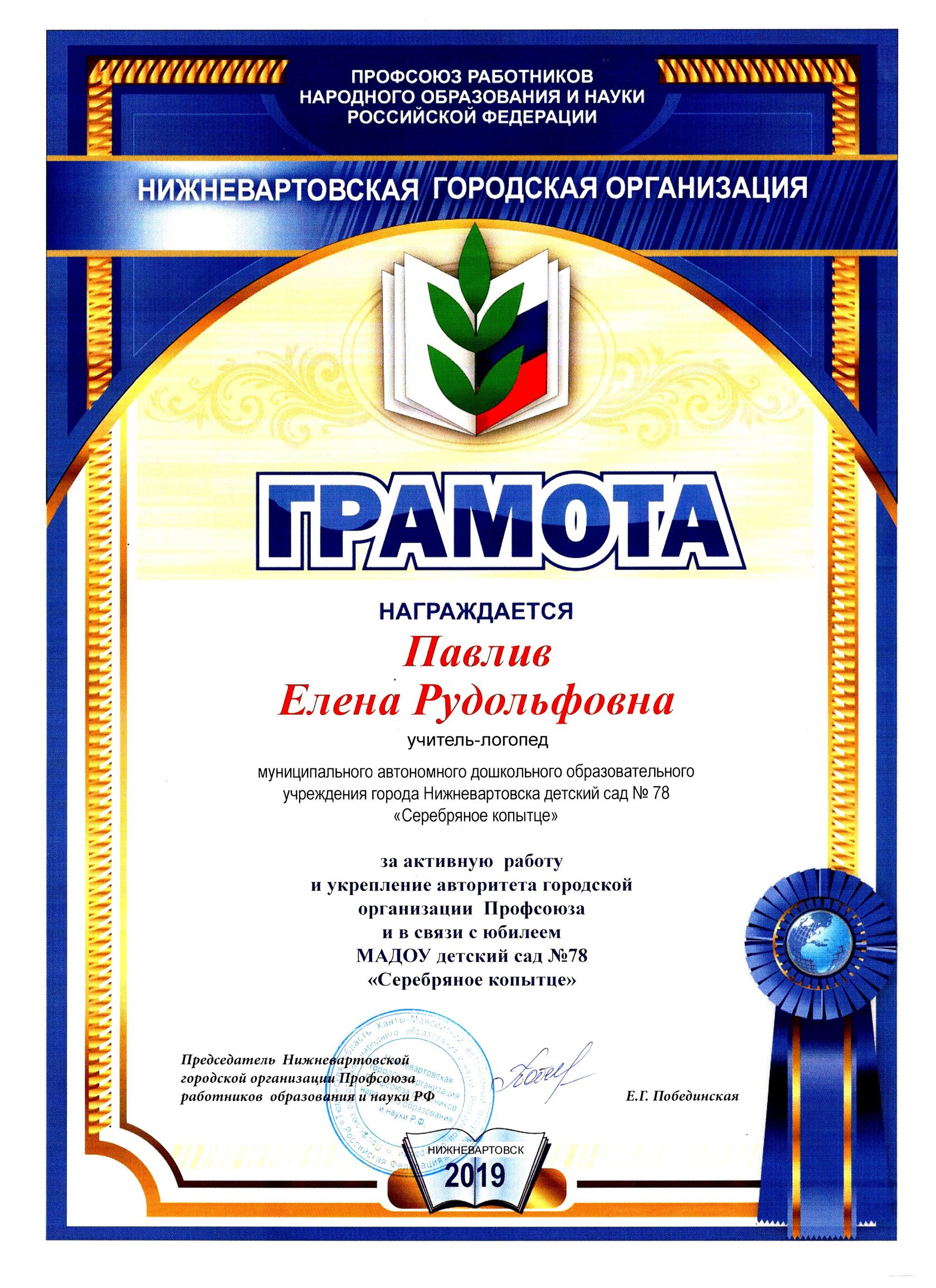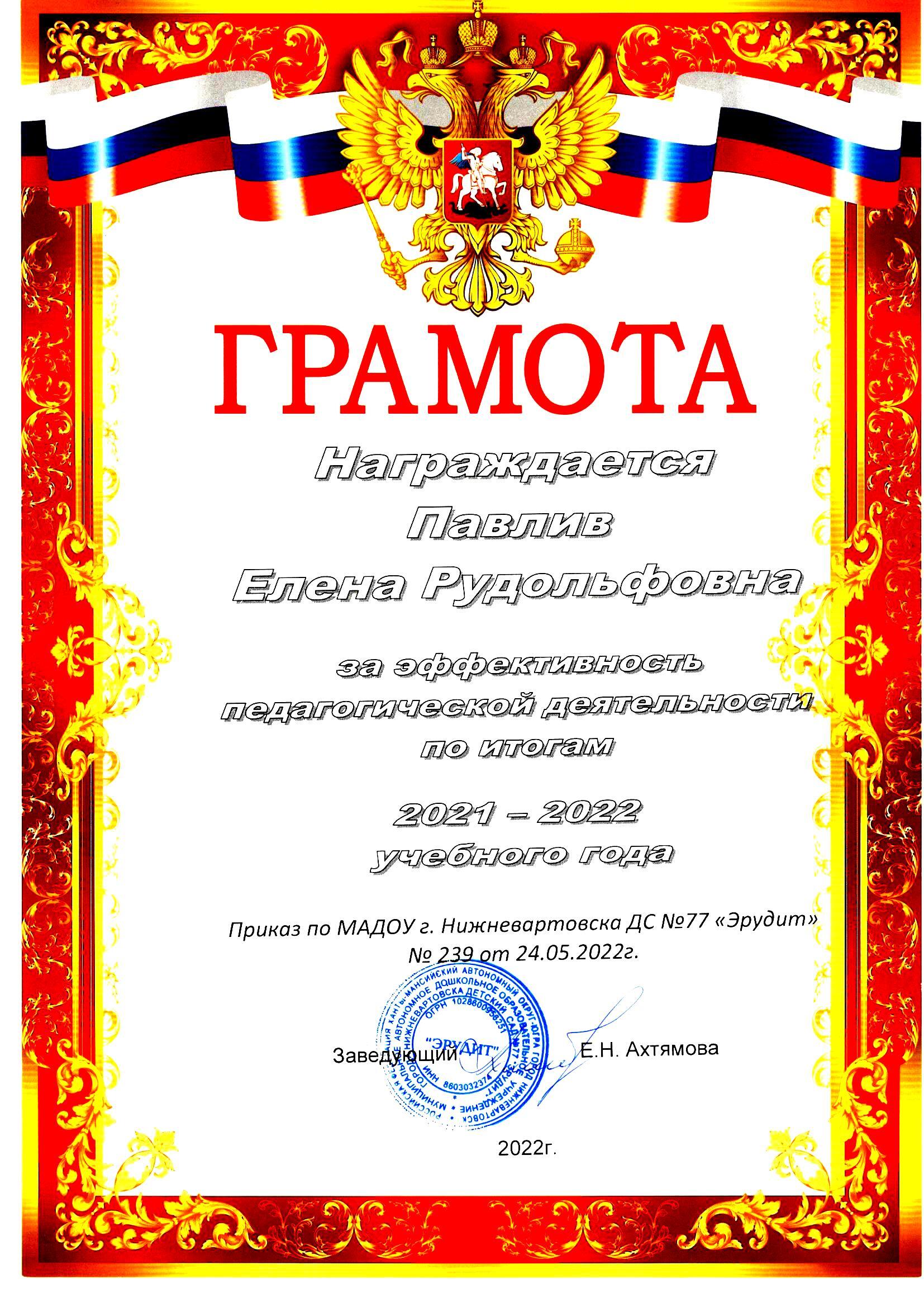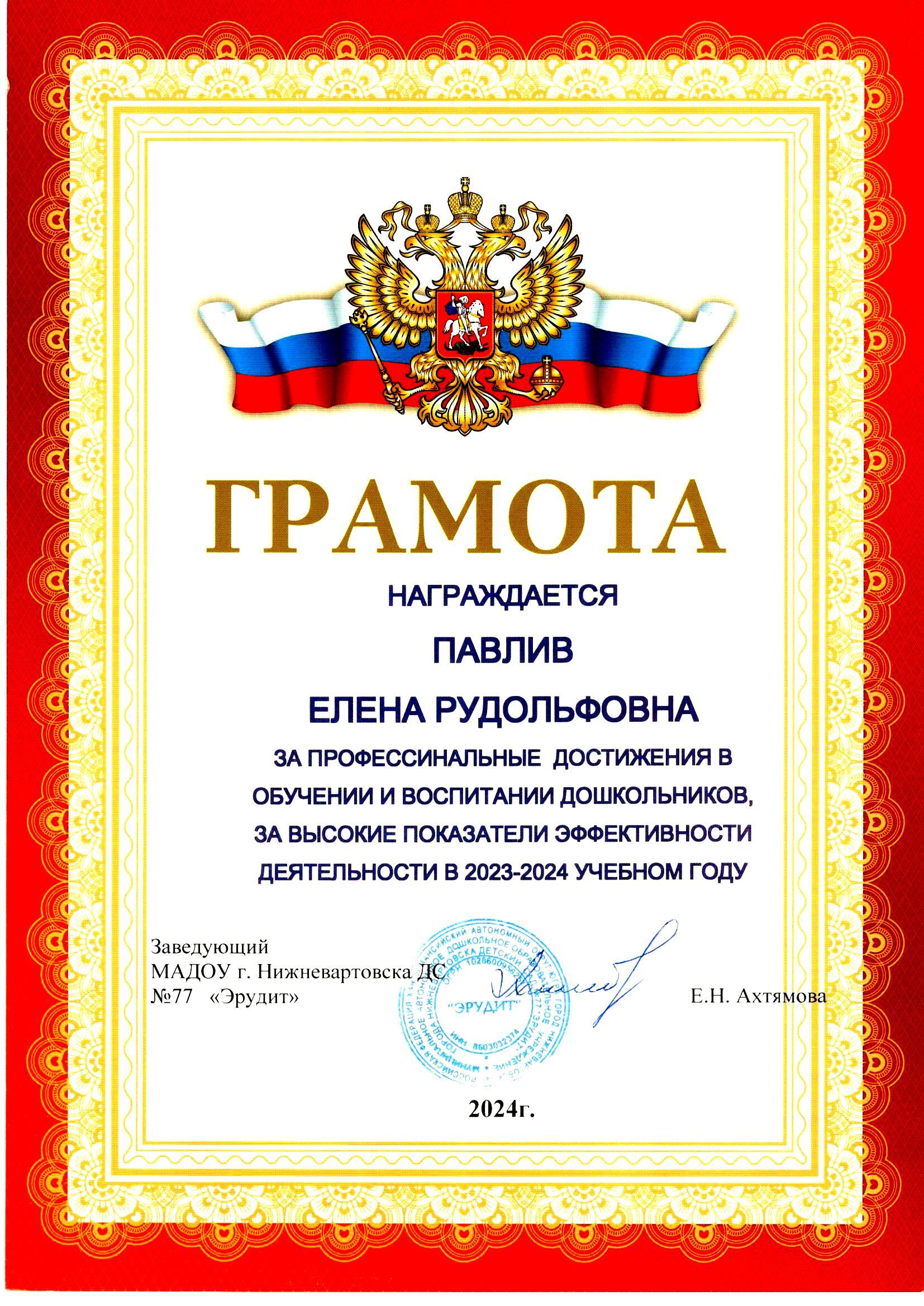 Почетная грамота Министерства образования и науки Российской Федерации